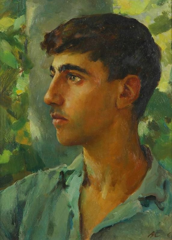 Работа выполнена в вертикальном формате и представляет собой погрудный портрет юноши с поворотом головы влево, изображённого в профиль. Короткие чёрные волосы, прямой крупный нос, плотно сжатые полные губы и небольшие усики над верхней губой подчёркивают индивидуальные черты модели. Юноша одет в бирюзовую рубашку с расстёгнутым воротником. На фоне изображена светло-зелёная листва, что формирует гармоничную цветовую гамму произведения.