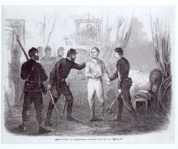 После того, как командующий Огайским военным округом генерал Эмброуз Бернсайд[3] подписал Приказ № 38 (англ. General Order Number 38), которым на территории округа запрещались любые действия против правительства, Валландигэм выступил 1 мая 1863 года с оппозиционным заявлением, назвав Линкольна «королём» («King Lincoln»). 5 мая он был арестован, и 7 мая окружным военным судом приговорён к двум годам тюрьмы.