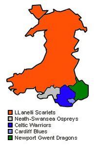 В Уэльсе, как и в таких странах как Новая Зеландия, Австралия и ЮАР введена региональная система управления. По этой системе, введённой в 2003 году, Уэльс был разделён на пять зон, за каждой из которых закреплялся определённый клуб, выступавший в Про12: в западной и северной зоне — «Скарлетс», в южной зоне — «Оспрейз», в центральной зоне — «Селтик Уорриорз», в восточной зоне — «Ньюпорт Гвент Дрэгонс» и в Кардиффе — «Кардифф Блюз»[9]. Однако через год клуб «Селтик Уорриорз» разорился и Валлийский регбийный союз перераспределил зоны на четыре клуба.