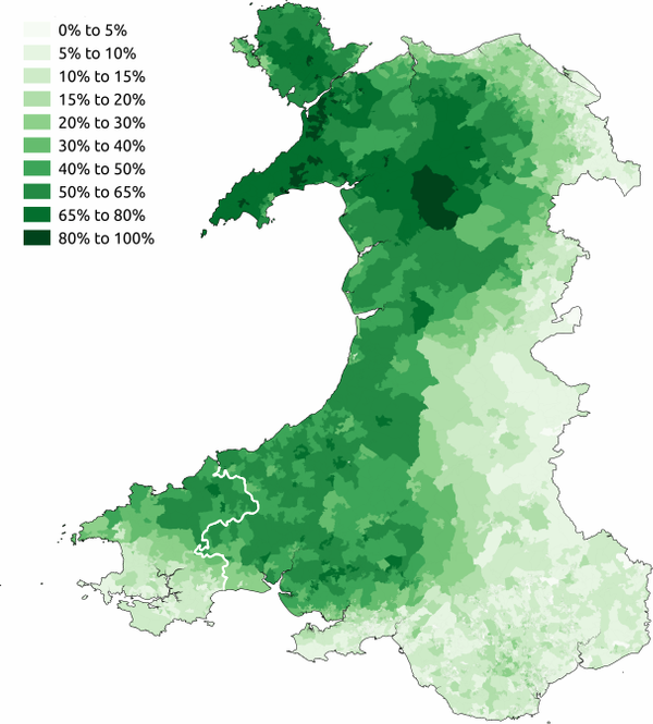 В качестве первого языка валлийский наиболее распространён на преимущественно сельских севере и западе Уэльса — в первую очередь, в Гуинете, Денбишире, Айл-оф-Англси, Кармартеншире, Северном Пембрукшире, Кередигионе и частях западного Гламоргана, но людей, хорошо говорящих по-валлийски, можно встретить по всему Уэльсу. При этом он почти не используется в больших городах на юге (Кардифф, Ньюпорт, Бридженд; в меньшей степени это относится к Суонси)[13][14].
