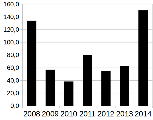 На 1 января 2014 года курс доллара США составил 32,66 рубля, а евро — 45,06[38][39]. С января по март 2014 года рубль ослаб на 14,9 %[40]. 3 марта в ходе торгов цена доллара США превышала 37 рублей, а евро поднимался выше 51 рубля в отдельные дни месяца[41]. Эти показатели обновили исторические максимумы периода экономического кризиса 2009 года[41]. С конца марта до июля рубль начал стабилизироваться[39][41], достигнув 28 июня максимума с января (33,63 и 45,82 рубля за доллар и евро)[39][42]. Но с июля рубль начал вновь ослабевать, обновив уже в конце августа исторические минимумы марта[41].