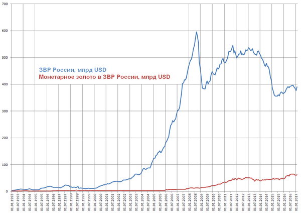 Золотовалютные резервы Центробанка за 2014 год сократились на четверть — с $509,6 до $385,5 млрд)[72][73], а за январь — май 2015 года — до $358,5 млрд[74]. Затем уменьшение резервов остановилось, и на 1 декабря 2015 года золотовалютный запас составил $364,7 млрд[75]