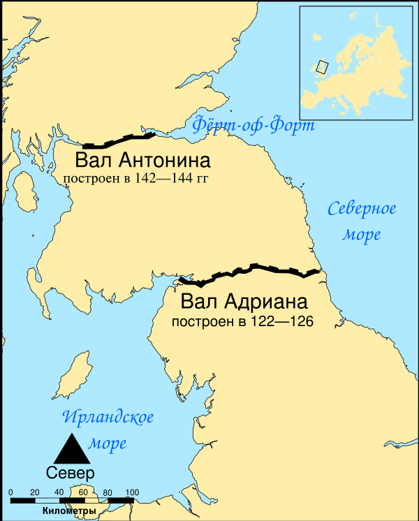 Вал пересекает северную Англию от Ирландского (залив Солуэй-Ферт) до Северного (крепость Сигидунум (Segedunum) у реки Тайн) морей у границы с Шотландией. Наиболее выдающийся памятник античности в Великобритании.