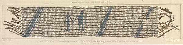 Эти пояса у алгонкинов и особенно у ирокезов имели ряд особых функций: они были украшением одежды, служили валютной единицей, а главное — с их помощью передавались разные важные сообщения. Такие вампумы у ирокезских племён обычно доставляли особые гонцы — вампумоносцы. Развитие вампумовых записей, по всей вероятности, привело бы к созданию и развитию у североамериканских индейцев письма. Исключительно посредством вампумов долгое время оформлялись договоры между белыми и индейцами. Сохранился, например «записанный» Шакамаксонский договор 1682 года между Пенном с одной стороны, и представителем делаваров (Ленни-Ленапе) Таманендом — с другой. Согласно этому договору делавары уступали Пенну довольно обширную часть территории своего племени — современную Пенсильванию[1]. На этом вампуме изображён индеец и белый, символически держащиеся за руки.
