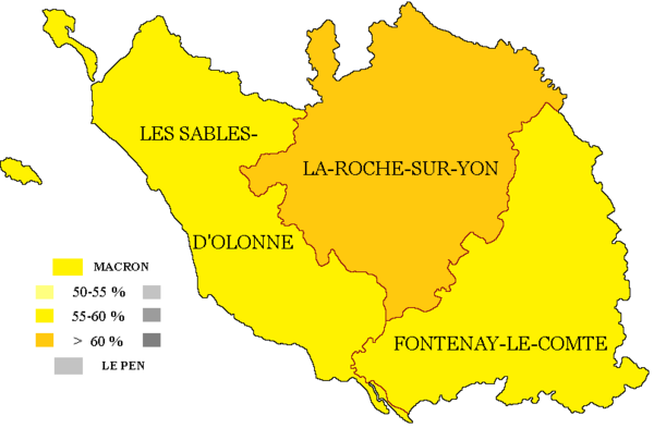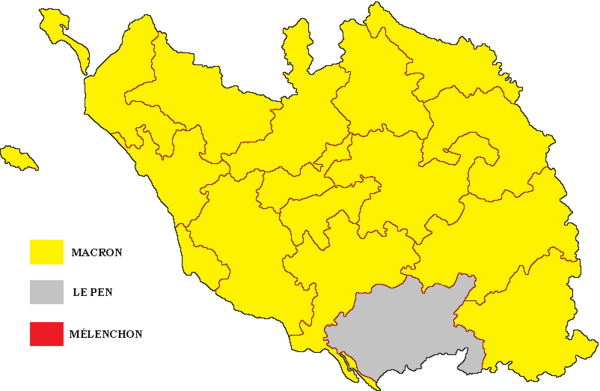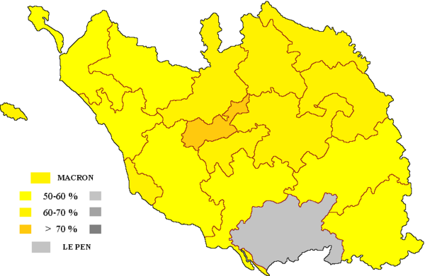(2017 год — 1-й тур: Эмманюэль Макрон («Вперёд!») — 26,26 %; Франсуа Фийон («Республиканцы») — 25,50 %; Марин Ле Пен (Национальный фронт) — 18,53 %; Жан-Люк Меланшон («Непокорённая Франция») — 15,08 %; Николя Дюпон-Эньян (Вставай, Франция) — 5,78 %; Бенуа Амон (Социалистическая партия) — 5,10 %. Прочие кандидаты — менее 5 %. 2-й тур: Эмманюэль Макрон — 69,96 % (в целом по стране — 66,10 %); Марин Ле Пен — 30,04 % (в целом по стране — 33,90 %)).