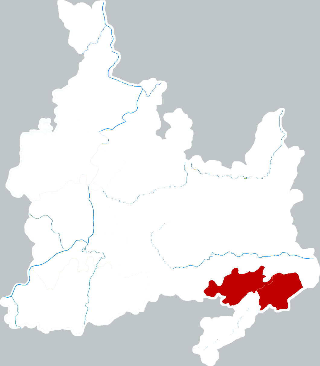 Район делится на 2 уличных комитета, 1 посёлок и 6 национальных волостей.
