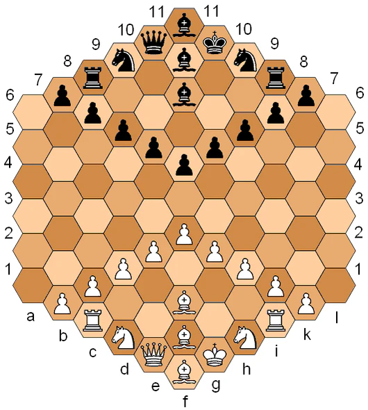 - Гексагональные шахматы Глинского — наиболее известный вариант на шестиугольной доске из 91 поля трёх цветов. Отличается особыми ходами пешек и коней[14][15]. Вариант рассматривался как способ борьбы с «ничейной смертью», но остался нишевым[16]; в 2025—2026 годах доступен онлайн (Hexchess.net)[17] и в приложениях[18].