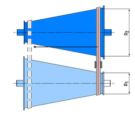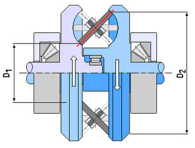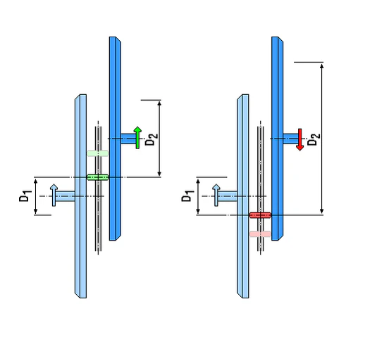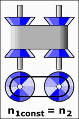Передаточное отношение в пределах диапазона регулирования здесь изменяется посредством взаимообратного изменения расстояния между парой соосных дисков, что переводит гибкую связь на иной радиус соединения (при этом увеличение радиуса соединения со стороны ведущих дисков приводит к уменьшению радиуса соединения со стороны ведомых дисков и наоборот). Осевую подвижность могут иметь как все 4 диска, так и только по одному в каждой паре. Механизм регулирования вариатора в принципе может обеспечивать постоянную величину натяжения ремня, независимо от степени износа, но это не всегда бывает реализовано.[6] Управление регулированием может быть как автоматическим, так и вручную, посредством шпинделя или рычага.[7] Сама управляющая система может быть механической, гидравлической или комбинированной. Диапазон регулирования определяется диаметром дисков и может быть асимметричным относительно прямой передачи.