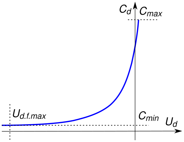Зависимость динамической ёмкости от напряжения называется вольт-фарадной характеристикой и для варикапа приближённо описывается функцией: