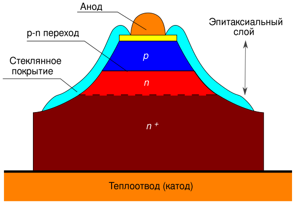 Боковая поверхность структуры для защиты выходящего на поверхность p-n-перехода и увеличения обратного пробойного напряжения покрывается легкоплавким стеклом.
