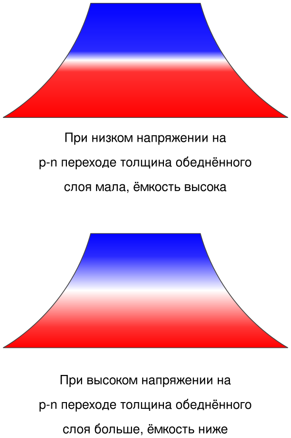 В соответствии с формулой для ёмкости плоского конденсатора, с ростом расстояния между обкладками (вызванной ростом значения обратного напряжения) ёмкость p-n-перехода будет уменьшаться. Это уменьшение ограничено толщиной базы, далее которой толщина обеднённого слоя увеличиваться не может, по достижении этого минимума ёмкости с ростом обратного напряжения ёмкость не изменяется. Другой ограничивающий фактор управляемого снижения ёмкости — электрический лавинный пробой обеднённого слоя.