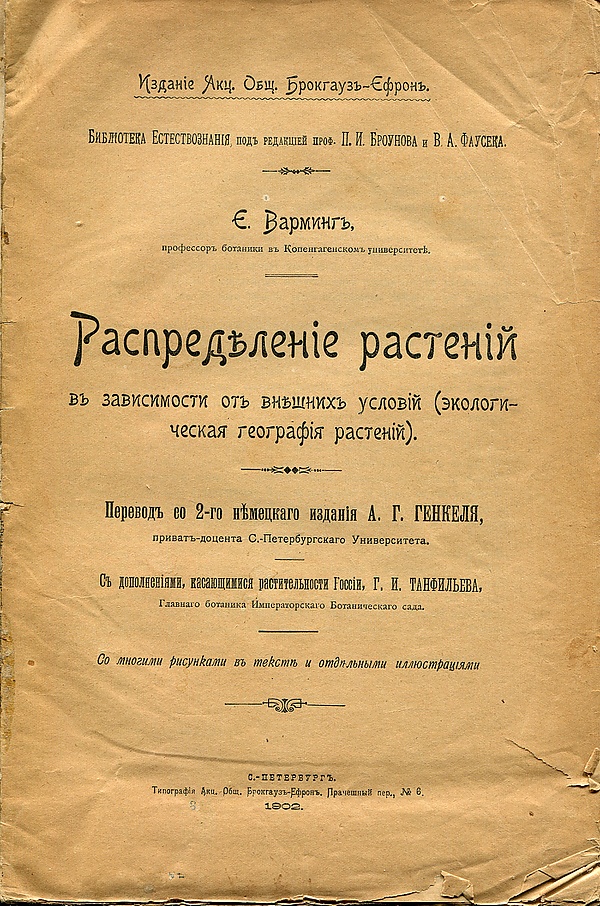- Вармингъ Е. Распредъленіе растеній въ зависимости отъ внъшнихъ условій — (ойкологическая географія растеній) / Перевод со 2-го немецкаго издания А. Г. Генкеля; с дополнениями, касающимися растительности России, Г. И. Танфильева. — СПб.: Брокгауз—Ефрон, 1902—1903. — Вып. 1. — 1902.; вып. 2. — 1903.; вып. 3 и последний: Главнейшия черты растительности Россіи, Г. И. Танфильева. — 1903.