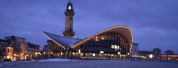 - В морском порту Варнемюнде много навигационных сооружений. Среди них — действующий береговой маяк, расположенный на башне высотой около 37 метров. Построен в 1897 году.