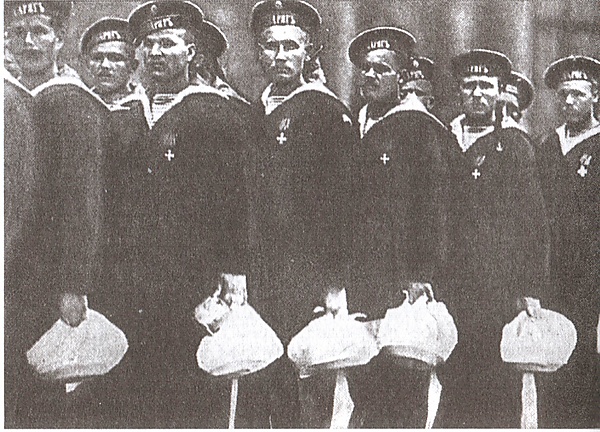16 апреля 1904 года они прибыли в Петербург и, выстроившись колоннами, промаршировали от Николаевского вокзала до площади Зимнего дворца. Здесь моряков-героев приветствовал император Николай II. Все они были приглашены на торжественный обед во дворец, где по этому случаю были приготовлены специальные обеденные приборы, которые после торжества были отданы морякам. В соборе Зимнего дворца был отслужен благодарственный молебен, в котором участвовал полный хор Придворной певческой капеллы (в обычное время разделённый на части между церквами нескольких императорских дворцов). Всем матросам «Варяга» в подарок от Николая II были вручены именные часы[22].