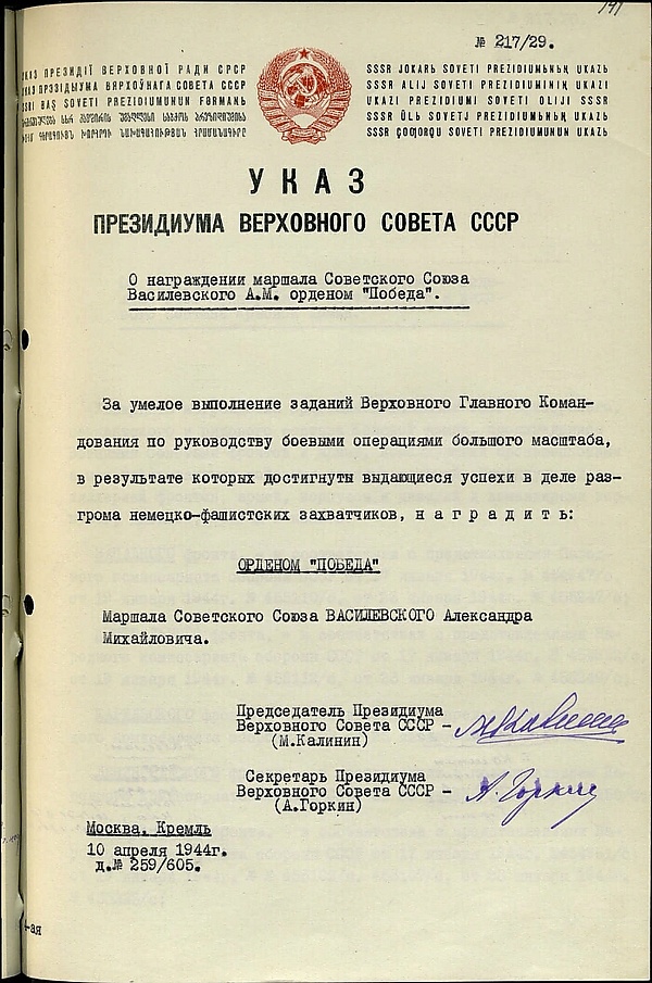 19 апреля 1945 года Василевский был награждён вторым орденом «Победа».