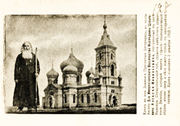 В 1897 году Василий объявил о сборе денег на строительство нового каменного храма в родном селе (первоначально в честь «Священного коронования Императорских Величеств», Знамения Пресвятой Богородицы и Царицы Александры[30], Герман Беликов писал, что Василий Босоногий был удостоен личного приглашения на коронацию[7]). Позже было принято решение посвятить храм Николаю Чудотворцу в честь рождения наследника престола[31][32]. В ходе своих путешествий[Прим 2] он собирал деньги на строительство. В 1906 году был возведён фундамент будущего храма, утверждён его архитектурный проект[Прим 3], собраны материалы для строительства и отлиты колокола[32]. Строительство храма было завершено только в 1910 году. Торжественное освящение церкви состоялось 5 [18] декабря 1910[36][37]. Храм был расположен на возвышенности перед перекрестком дорог, ведущих в город, с пятью куполами и двумя приделами: в честь преподобного Серафима Саровского и святителя Алексия Московского[38]. Он считался одним из самых красивых в Ставрополье[26]. Храм был выстроен из камня, при нём находился бассейн для освящения и крещения с фонтаном. Площадь рядом с церковью была выложена из чугунных плит. В церкви одновременно могли разместиться 1,5 тысячи верующих[39][40]. В это время в селе постоянно проживало всего 7,5 тысяч душ обоего пола[39][37]. Также в своём селе Василий построил странноприимный дом[29][36][2].