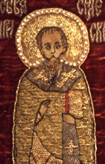 Сед изжелта, брада Евфимиева или аки Власиева, подвоилася, ризы кресты черны, белилы прописаны, кудряв, амфор (омофор) и Евангелие.