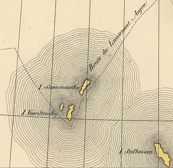 В 1823 году остров посетил начальник гидрографической экспедиции лейтенант П. Ф. Анжу при своём следовании на остров Бельковский. По данным его исследований, длина острова Васильевский составила 7,4 км, ширина 0,5 км.