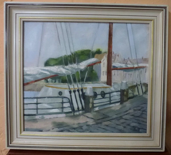 Пейзаж изображает солнечный день. На переднем плане расположена часть причала с булыжной мостовой, двумя каменными тумбами и ограждением. Поблизости пришвартована яхта с опущенными парусами. Справа на заднем плане видны силуэты многоэтажных зданий, а за ними — крупные деревья с зелёной листвой. По левой стороне едва проступает береговая линия. Небо на картине серо-голубого цвета, погода безоблачная.
