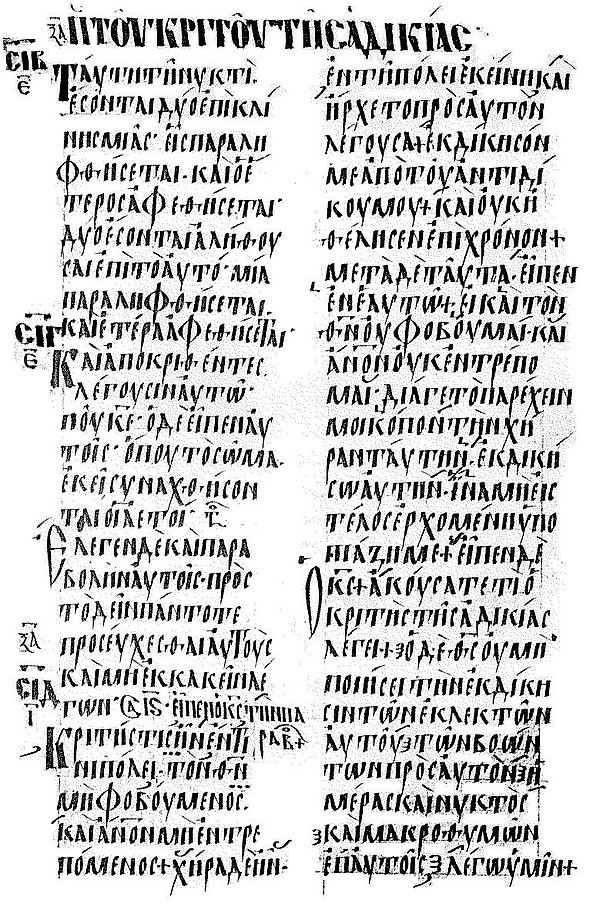 Текст на листе расположен в две колонки, 27 линии в колонке. Греческие унциалы похожи на славянские буквы (кириллицу).