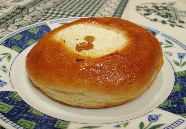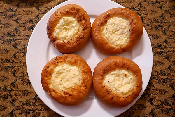 Подошедшее тесто раскатывают в жгут и разрезают на равные кусочки (размером примерно с куриное яйцо), которые подкатывают в шарики и укладывают швом вниз на смазанный маслом противень. Оставляют расстаиваться 10—15 минут. Затем в середине шариков делают углубление (например, донышком стакана или толкушкой) диаметром 5[16]—10[17] см. Края смазывают смесью желтка и молока для получения румяной корочки, а углубления наполняют творожной начинкой, которую можно выкладывать ложкой или из кондитерского мешка.