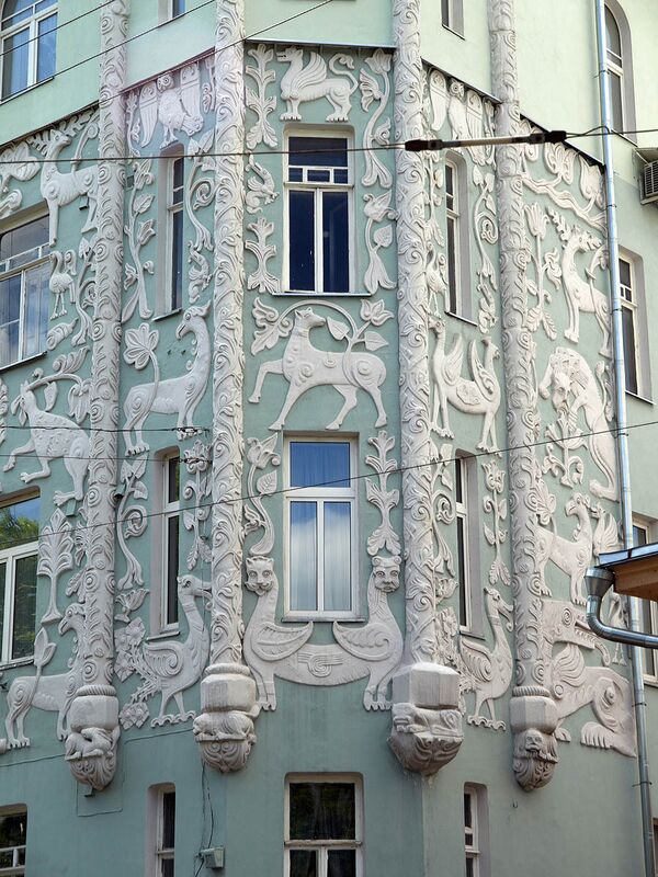 - Оформление фасада доходного дома при церкви Святой Троицы «что на Грязех» (архитекторы Л. Л. Кравецкий, П. К. Микини) (1908—1909, Москва, Чистопрудный бульвар, 14; надстроен двумя этажами в 1945 году Б. Л. Топазовым); объект культурного наследия регионального значения[13];