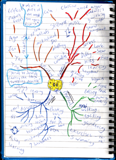 Картографирование (составление карт) использует пространственную организацию и диаграммы для сбора информации.[29] Идеи записываются в виде узловых связей с линиями, соединяющими идеи вместе.[29] Интеллект-карты рисуются в виде древовидной структуры от центральной точки, цели или цели в центре страницы, а затем разветвляются наружу, чтобы определить все идеи, связанные с этой целью.[30] Цвета, мелкая графика и символы часто используются для облегчения визуализации информации. Он также используется для планирования и написания эссе.[30]