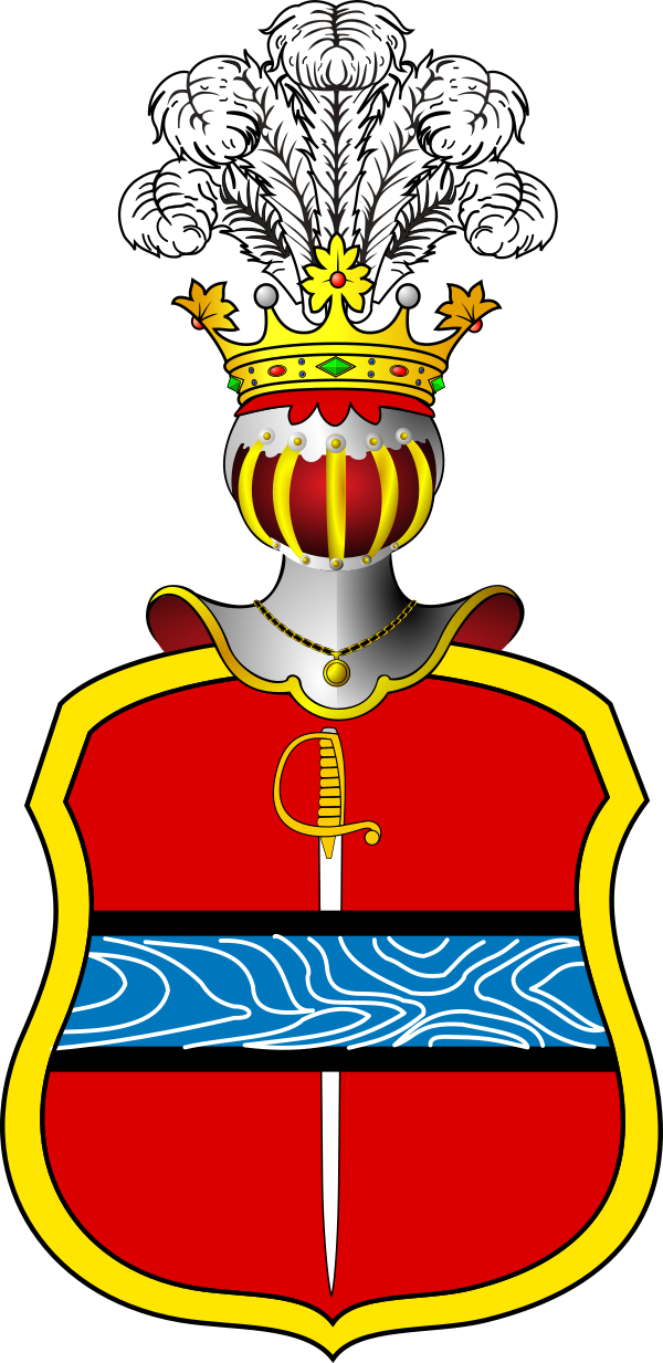 В щите с золотою окраиною, в красном поле голубой волнистый пояс с чёрными каемками, на шпаге поставленной вертикально золотою рукоятью вправо. В навершии шлема пять страусовых перьев.