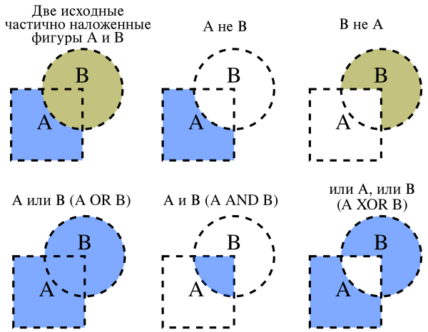 Также используются более изощрённые преобразования, например, булевы операции применённые к замкнутым фигурам как множествам точек, принадлежащих данным фигурам: объединение, дополнение, пересечение как показано на рисунке и т. д.