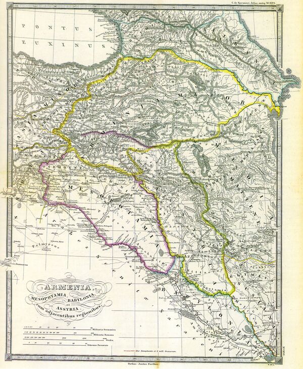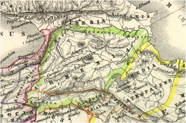 Великая Армения ограничивается с севера частью Колхиды, Иберией и Албанией по вышеуказанной линии, проходящей через реку Кир.