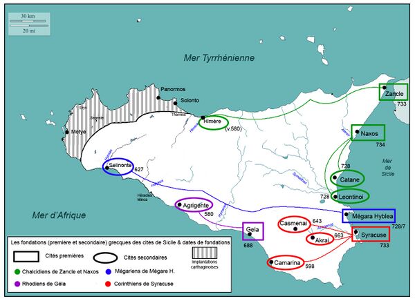 Город Занкла (совр. Мессина) основан халкидцами между 730—720 годами до н. э. на месте более древнего поселения бронзовой эпохи. Расположенный непосредственно в Мессинском проливе, он мог контролировать основной путь с Востока в западную Италию. Сначала здесь обосновались пираты эвбейского происхождения из Кум, но вскоре появились и настоящие переселенцы. Ойкистами выступали Периклемен из Кум и Кратемен из Халкиды. Развалины первичного поселения удивляют непривычно большим размахом. Занкла не имела достаточно плодородных земель, поэтому горожане около 717—710 годов до н. э. основали на северном берегу Сицилии Милы и далее на запад по северному берегу около 648 года до н. э. Гимеру (крайний пункт греческих колоний на северном берегу).