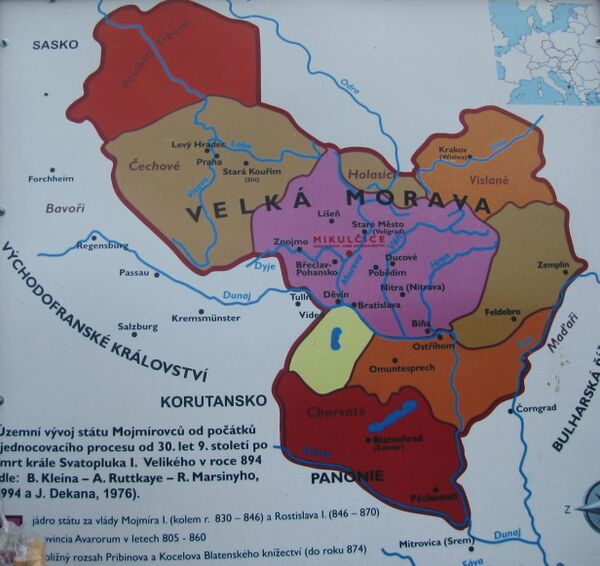 Имея цель крестить Моравию, король Баварии Людовик II Немецкий в 829 году передал земли Моравии под юрисдикцию епископства Пассау. Моймир I поддержал христианских миссионеров и в 831 году епископ епархии Пассау Регинар крестил его и всех мораван[17]. Около 840 года Людовик II Немецкий отдал паннонскую часть Каринтийской марки вокруг Балатона князю Прибине. Его столицей стал Блатенград (Мосабург) в бассейне реки Зала[18].