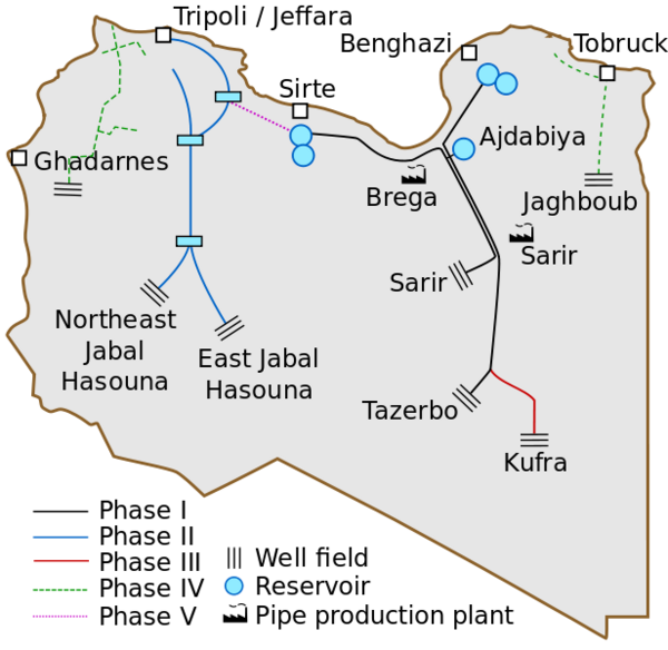 - С 26 августа 1989 года начались работы второй фазы — «Воду в Триполи», конечная цель которых — доставка в Триполитанию 1 млн м³ воды в день.