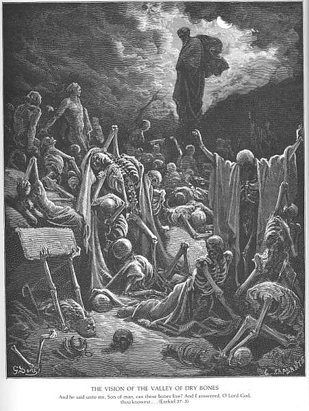 - паремия Иез. 37:1-14 — видение Иезекииля о поле «сухих костей», которые по слову Божию соединяются жилами, покрываются кожею, а затем, после схождения на них духа, мертвецы оживают. «И узнаете, что Я Господь, когда открою гробы ваши и выведу вас, народ Мой, из гробов ваших, и вложу в вас дух Мой, и оживете, и помещу вас на земле вашей, и узнаете, что Я, Господь, сказал это — и сделал, говорит Господь.» Это видение Иезекииля представляется как пророчеством о воскресении мёртвых, так и о схождении Духа Святого (поэтому читается также в Пятидесятницу),