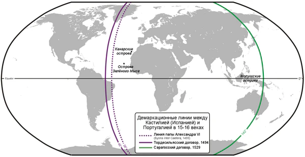Вскоре после прибытия Колумба из «Вест-Индии» возникла необходимость в разделении сфер влияния между Испанией и Португалией с целью избежания конфликтов[53]. 4 мая 1493 года, через два месяца после прибытия экспедиции Колумба, католические короли получили от Александра VI буллу (Inter caetera), согласно которой все земли к западу и к югу от линии, соединяющей полюса Земли и проходящей в ста лигах западнее и южнее любого из Азорских островов или островов Кабо-Верде, принадлежали Испании, впоследствии все материковые земли и острова, принадлежащие Индии. Это не устраивало Португалию, которая не могла претендовать на земли, недавно открытые ею к востоку от этой линии.