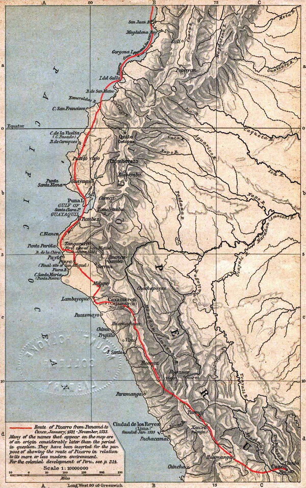 Согласно докладу Хуана де Самано, секретаря Карла I, впервые достоверно о Перу стало известно в 1525 году в связи с завершением первой Южной экспедиции Франсиско Писарро и Диего де Альмагро[90]. Эта первая из трёх экспедиций в составе около 80 человек и имевшая в своём распоряжении 40 лошадей отправилась 13 сентября 1524 года на завоевание Перу. Экспедиция завершилась неудачей, до того момента, как непогода, голод и стычки с местными жителями, в которых Альмагро потерял глаз, заставили повернуть назад, она дошла не далее Колумбии. О ходе экспедиции говорят названия населённых пунктов, которые давали им испанцы: Puerto deseado (желанный порт), Puerto del hambre (голодный порт) и Puerto quemado (сожжённый порт). Двумя годами позже они начали второй поход, с трудом получив на него разрешение от губернатора Панамы. В августе 1526 года они вышли на двух кораблях с 160 солдатами и несколькими лошадьми. Достигнув реки Сан-Хуан, они разделились: Писарро остался исследовать болотистые берега, а Альмагро вернулся за подкреплениями. Кормчий Бартоломе Руис направился на юг, и после пересечения экватора захватил плот из Тумбеса. К его удивлению, на нём везли ткани, керамику, а также золото, серебро и изумруды, которые были главной целью экспедиции. Вскоре присоединился Альмагро с подкреплениями, и они продолжили путь. После долго перехода, преодолевая сильные ветра и течения, экспедиция дошла до Атакамеса, где они обнаружили густонаселённые земли, которые находились под властью Империи Инков, но они показались конкистадорам настолько опасными, что они не пошли вглубь страны.