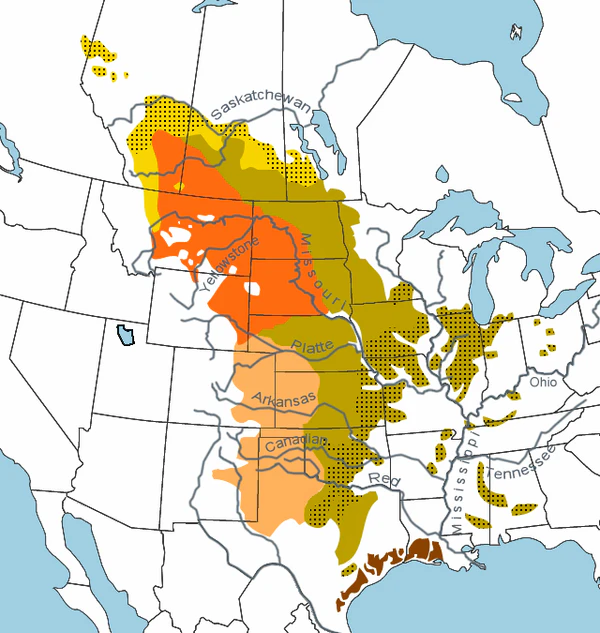 До XVII века Великие равнины оставались малонаселёнными, но затем на них начали проникать испанские колонисты из Мексики, познакомившие местное население с лошадьми и домашними коровами. Освоение местными народами верховой езды привело к XIX веку к формированию развитой индейской культуры Великих равнин[4]. В XVIII и начале XIX века бизоньи стада привлекли на равнины индейские племена лакота и кроу, а в 1820—1830-е годы началось переселение с территории восточных штатов вытесняемых оттуда племён, в частности, чероки. Эти народы конкурировали за место в прерии с ранее обитавшими там пауни и осейджами[10].