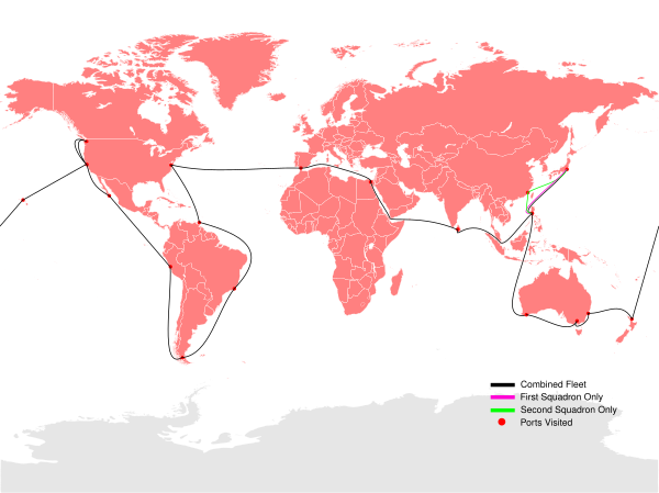Так как строительство Панамского канала ещё не было завершено, путь следования был проложен через Магелланов пролив. Прибыв к месту встречи с разных сторон, флот продолжил путь согласно тщательно продуманному плану. Масштаб операции был беспрецедентным в истории США: в организацию были вовлечены практически все ресурсы ВМФ Штатов. Во время плавания было установлено несколько мировых рекордов, одним из которых было рекордное количество кораблей, одновременно совершивших кругосветное плавание.