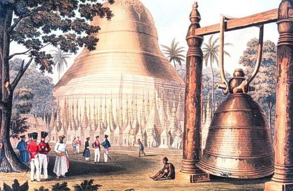 ...В зале находился очень большой колокол, который мы измерили, и обнаружили, что он имеет семь шагов и три ширины ладони в окружности, и что весь он от верха до низа покрыт письменами так плотно, что они налезают друг на друга; они очень хорошо видны, но нет ни одного народа, который мог бы их прочесть, даже сам народ Пегу не помнит, ни что там написано, ни что там изображено.