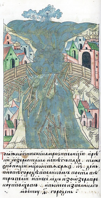 Новгородская первая летопись старшего извода сообщает, что в 1143 году от осенних дождей вода в Волхове и всюду поднялась очень высоко. Озеро Ильмень ночью стало замерзать, но ветер разметал льдины и вынес в Волхов, где ими разбило мост, а четыре городни вообще неизвестно куда унесло: «Въ сё же лѣто (6651) бяше велика въ Волхове, и хоромъ много сноси… Стояше вся осенина дъждева, от Госпожина дни до Корочюна, тепло, дъжгь; и бы вода велика вельми въ Волхове и всюде, сено и дръва разнесе; озеро морози въ нощь, и растьрза вѣтръ, и вънесе въ Волхово, и поломи мостъ, д (4) городнѣ отиноудь бе знатбе занесе. Въ то же лѣто оженися Святопълкъ Новгородѣ, приведе жену из Моравы, межи 13 Рожествомь и Крещениемь»[6].