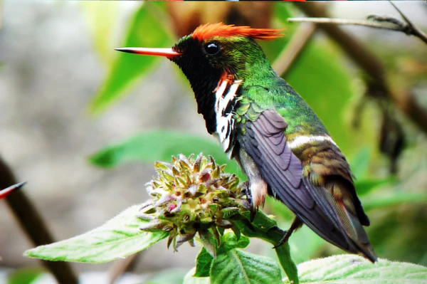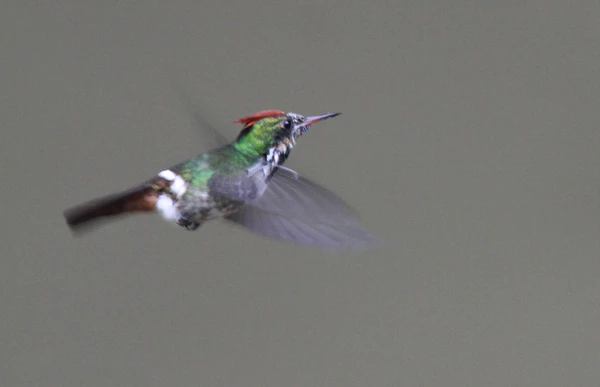 Одна из самых мелких птиц, её длина составляет от 7,1 до 7,7 см, а средняя масса — 2,66 г. У обоих полов короткий, прямой, красный клюв с чёрным концом и бронзово-зеленая верхняя часть тела с белой полосой на пояснице. Взрослые самцы имеют хохолок из удлиненных рыжевато-оранжевых перьев и белые с темными поперечными полосами веерообразные длинные перья на щеках. Его лоб и горло радужно-зеленые, а нижняя часть тела серовато-зеленая. Его центральные рулевые перья бронзово-зеленые, а остальные рыжие с бронзово-зелеными кончиками и краями. У взрослой самки нет хохолка и длинных перьев на щеках. У неё беловатое горло с рыжими дисками и темными пятнами в виде полумесяца. Нижняя часть у неё серовато-зеленая, как у самца, но хвост в целом темно-бронзовый с рыжими концами. Молодые особи похожи на взрослую самку[2].