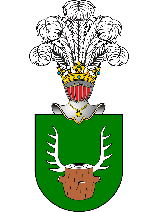 В голубом (или зелёном) поле пень, увенчанный оленьими рогами. Нашлемник: пять страусовых перьев.