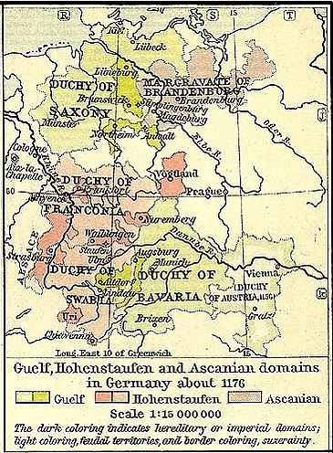 Наследник Генриха Гордого, Генрих Лев, в 1142 году смог получить Саксонию, а в 1156 году новый император, Фридрих I Барбаросса, передал ему и Баварию, но без Австрии, возведённой в статус герцогства. В результате последующих походов на восток начиная с 1160 года Генрих Лев захватил почти всю территорию бодричей и стал владельцем огромной территории к востоку от Эльбы. Однако усиление Генриха Льва вызвало резкий конфликт между ним и императором Фридрихом I Барбароссой. Когда Генрих Лев отказался от участия в походе императора в Италию, Фридрих организовал в 1180 году над ним судебный процесс. В результате Генрих Лев лишился большинства своих владений, в его руках остались только Брауншвейг и Люнебург.