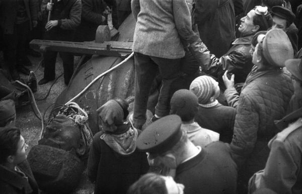 Многие подошли к стоявшим здесь танкам, забирались на них и втыкали знамёна в стволы орудий.