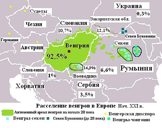 Венгерское присутствие в Восточной Европе в том числе и в Трансильвании, населённой в IX веке в основном румынами, постепенно нарастало с конца IX века. Славяне также присутствуют в этом регионе с конца X века, мигрируя туда с территории современной Польши. Тем не менее, венгерский язык и культура не оказали такого влияния на жизнь и быт румын как южные славяне, с которыми румын объединяла общая религия (православие) и общий литературный церковнославянский язык. Католики и позже также протестанты, венгры особенно активно селились на территории Трансильвании (с 1920 года принадлежащей Румынии). Когда Трансильвания подчинилась власти венгерского короля, венгры вместе с немцами составили основу правящего класса Трансильвании вплоть до 1918 года (Австро-Венгрия.) Транслейтания — венгерская часть империи отличалась склонностью к мадьяризации меньшинств с 1867.г. и антирумынской позицией в вопросах внутренней политики. Румыны также традиционно показывали склонность к враждебной политике в отношении венгров и стремились дезинтегрировать Венгрию. При этом сами венгры сохраняли и сохраняют определённые родовые различия. В Румынии выделяются следующие субэтнические группы венгров: секеи и сильно румынизированные чангоши.