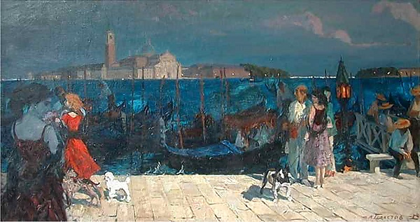 Полотно представляет собой ночную ведуту с изображением городской набережной, залитой искусственным светом. На переднем плане по горизонтали расположены фигуры: слева со спины показана девушка в тёмном сарафане, рядом с ней — обнявшиеся юноша и рыжеволосая девушка в красном платье, а также две собаки. Ближе к центру у фонаря стоят мужчина и две женщины с собакой; справа выделяется группа гондольеров в шляпах. На втором плане изображена широкая тёмно-синяя полоса воды с гондолами, в которых видны отдельные фигуры. Вдали находится остров с архитектурными сооружениями, среди которых левее центра выделяется церковь Сан-Джорджо-Маджоре с зелёным куполом, фасадом с портиком и отдельно стоящей кампанеллой. По линии горизонта заметны огни города, небо написано в серо-синих и сиреневых тонах.