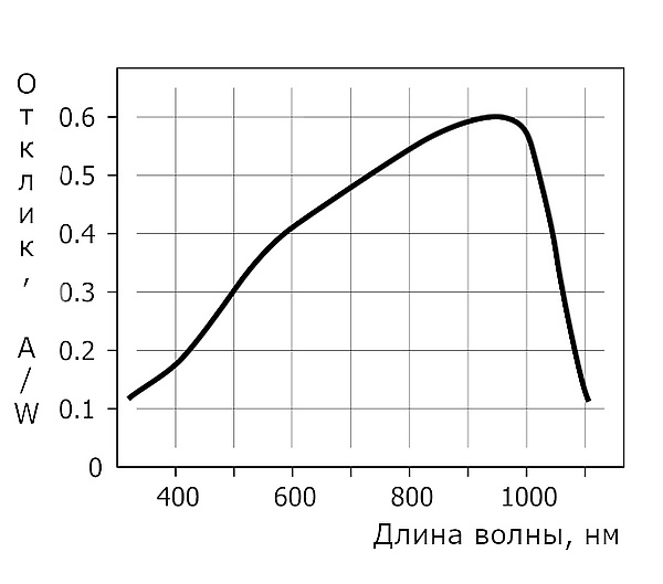 Реальные фотодиоды и фотоэлементы обладают спектральной зависимостью фототока от длины волны падающего на них света. Пример такой зависимости показан на рисунке 4. Спектральная зависимость фотодиода определяется шириной запрещённой зоны полупроводника со стороны длинных волн, для коротких — показателем поглощения и влиянием поверхностной рекомбинации, зависящей от длин волн падающего света.