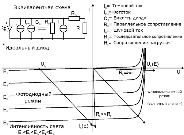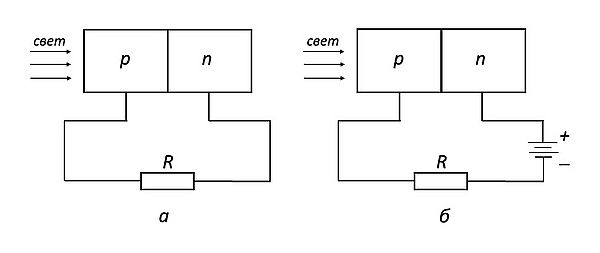 Существуют две схемы подключения -перехода к внешней электрической цепи: в вентильном и фотодиодном режиме (см. рисунок 2). При подключении внешней нагрузки согласно рисунку 2, схема а, фотоэдс в -переходе будет создаваться только частью носителей заряда, а другая будет обеспечивать ток через нагрузку, при этом напряжение на нагрузке составит величину: