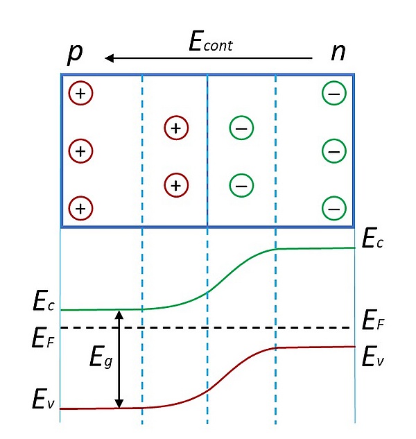 На рисунке 1 показано образование объёмного заряда в области -перехода и зонная схема, где — край (дно) зоны проводимости, — потолок валентной зоны, — ширина запрещённой зоны, — уровень Ферми. Освещение отсутствует.
