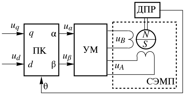 По сути, является в этом случае заданием значения амплитуды фазных напряжений. А ПК, осуществляя позиционную модуляцию сигнала формирует гармонические сигналы которые усилитель мощности (УМ) преобразует в фазные напряжения Синхронный двигатель в составе вентильного двигателя часто называют синхронным электромеханическим преобразователем (СЭМП).